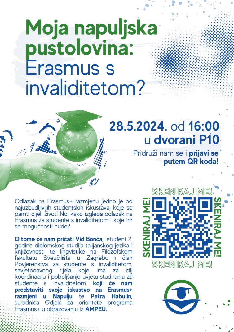 Odlazak na Erasmus+ razmjenu jedno je od najuzbudljivijih studentskih iskustava, koje se pamti cijeli život! No, kako izgleda odlazak na Erasmus za studente s invaliditetom i koje im se mogućnosti nude? O tome će u sklopu predavanja koje organizira Centar za podršku studentima i razvoj karijera (CARPO) Edukacijsko-rehabilitacijskog fakulteta pričati Vid Bonča, student 2. godine diplomskog studija Talijanskog jezika i književnosti te Lingvistike na Filozofskom fakultetu Sveučilišta u Zagrebu i član Povjerenstva za studente s invaliditetom, savjetodavnog tijela koje ima za cilj koordinaciju i poboljšanje uvjeta studiranja za studente s invaliditetom, koji će nam predstaviti svoje iskustvo na Erasmus+ razmjeni u Napulju te Petra Habulin, suradnica Odjela za prioritete programa Erasmus+ u obrazovanju iz AMPEU.