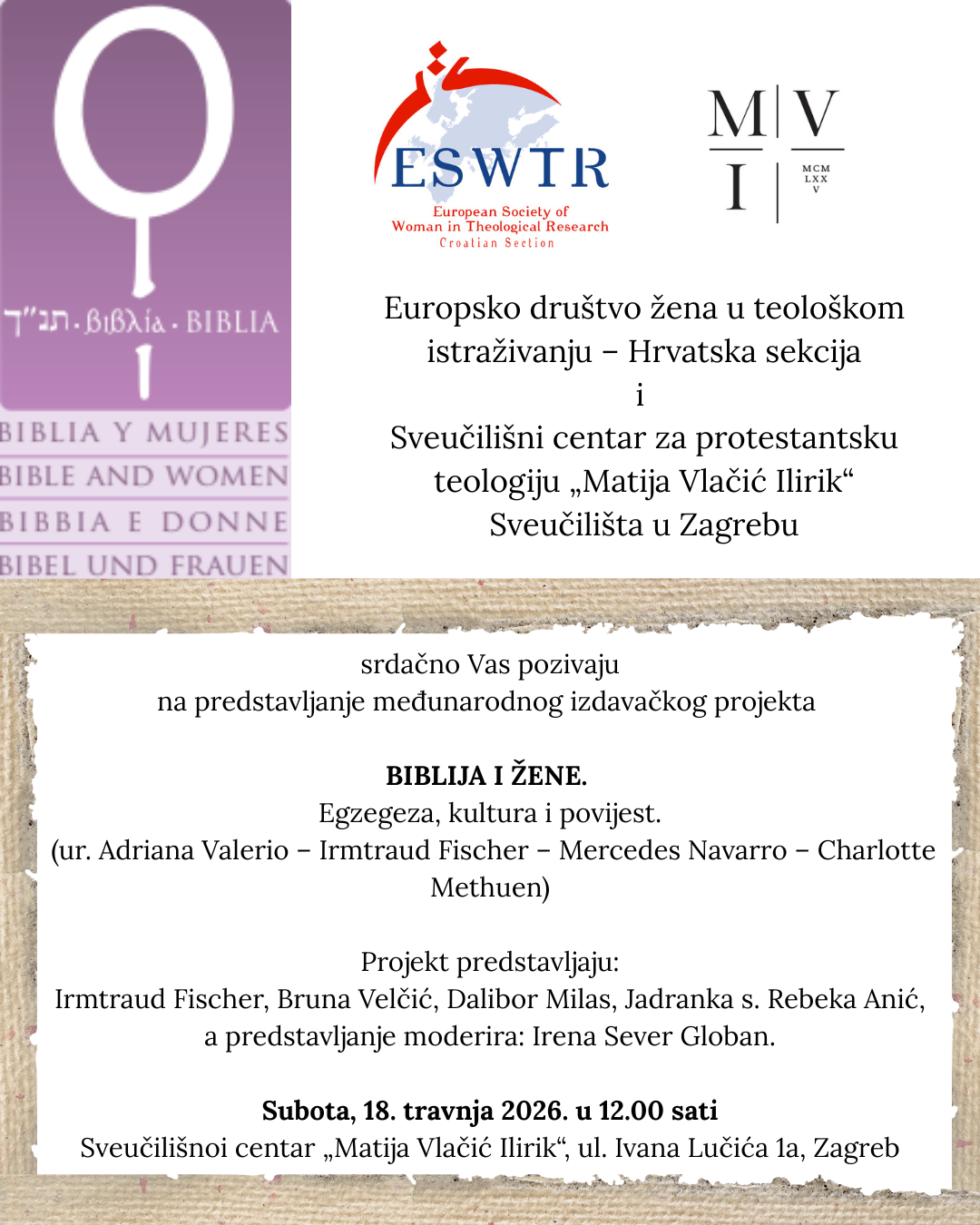 U subotu 18. travnja 2026. na našem Centru je predstavljen međunarodni izdavački projekt “Biblija i žene: egzegeza, kultura i povijest” o kojemu su govorili Irmtraud Fischer (članica uredništva projekta), te predavači na našem Centru: Bruna Velčić, Dalibor Milas i Jadranka s. Rebeka Anić. Program je moderirala Irena Sever Globan, a gošću iz Austrije je prevodila naša profesorica Ksenija Magda. Ovom prilikom je knjižnici našeg Centra uručena vrijedna donacija 21 sveska koje je tijekom zadnjih dvadeset godina iznjedrio ovaj projekt. Više o projektu možete saznati na službenoj stranici istoga: https://www.bibleandwomen.org/coll/EN/