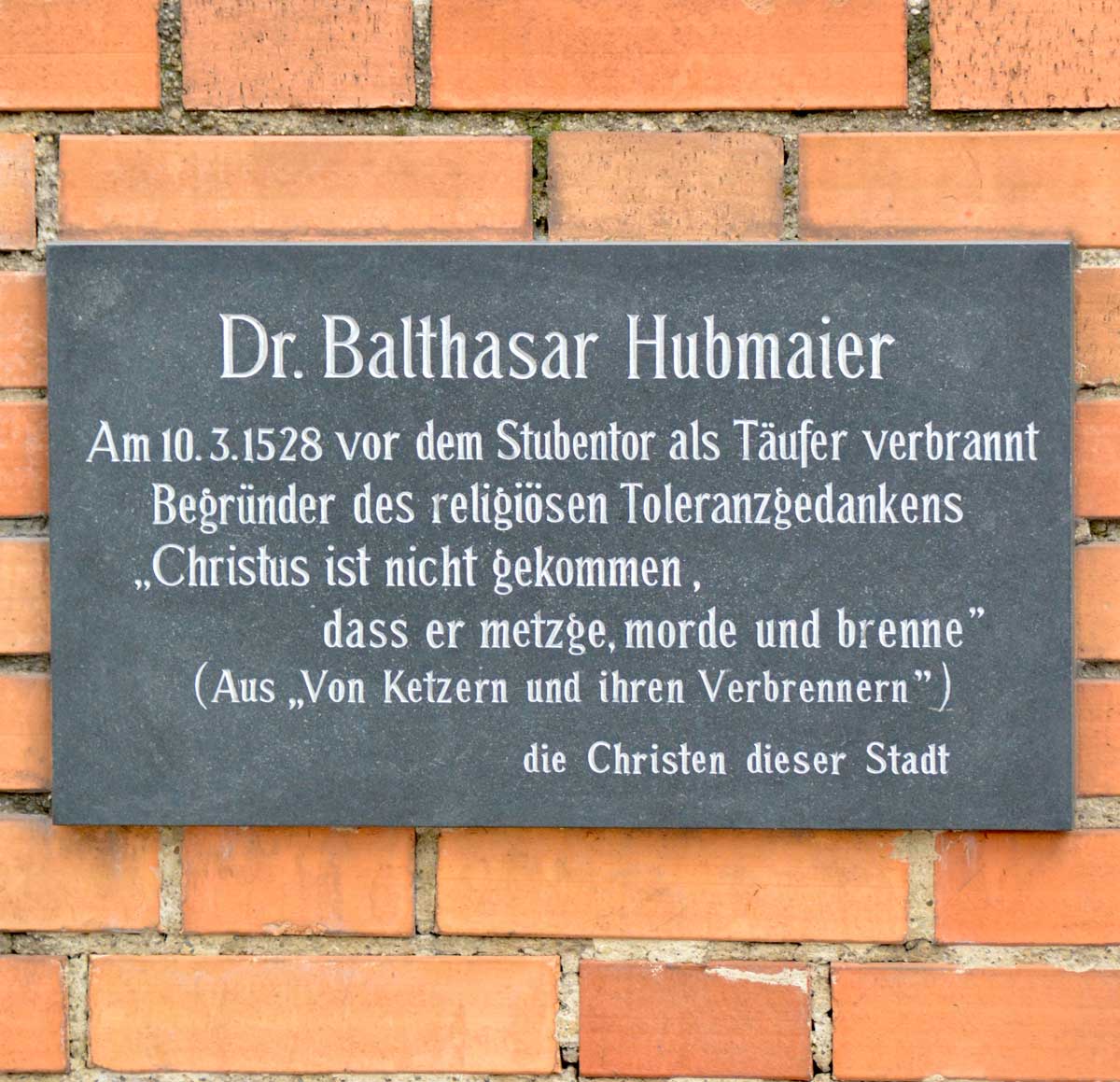 Hubmaieru su njihovi argumenti bili bliski, a uskoro ih i preuzima. Već početkom 1525. godine jasno i nedvosmisleno odbacuje krštenje dojenčadi u svojoj zajednici. U Waldshutu započinje uvoditi praksu krštenja odraslih vjernika, a djecu krsti isključivo na molbu roditelja koji su još bili nesigurni i pod snažnim utjecajem ranije tradicije. Istodobno javno poziva na otvorenu teološku raspravu o ovom pitanju i objavljuje spis O kršćanskom krštenju vjernika, u kojem nudi dokazati da krštenje djece nema biblijsku potporu i poziva na raspravu u kojoj bi ga se moglo uvjeriti u suprotno isključivo na osnovi biblijskih tekstova, što smatra nemogućim.